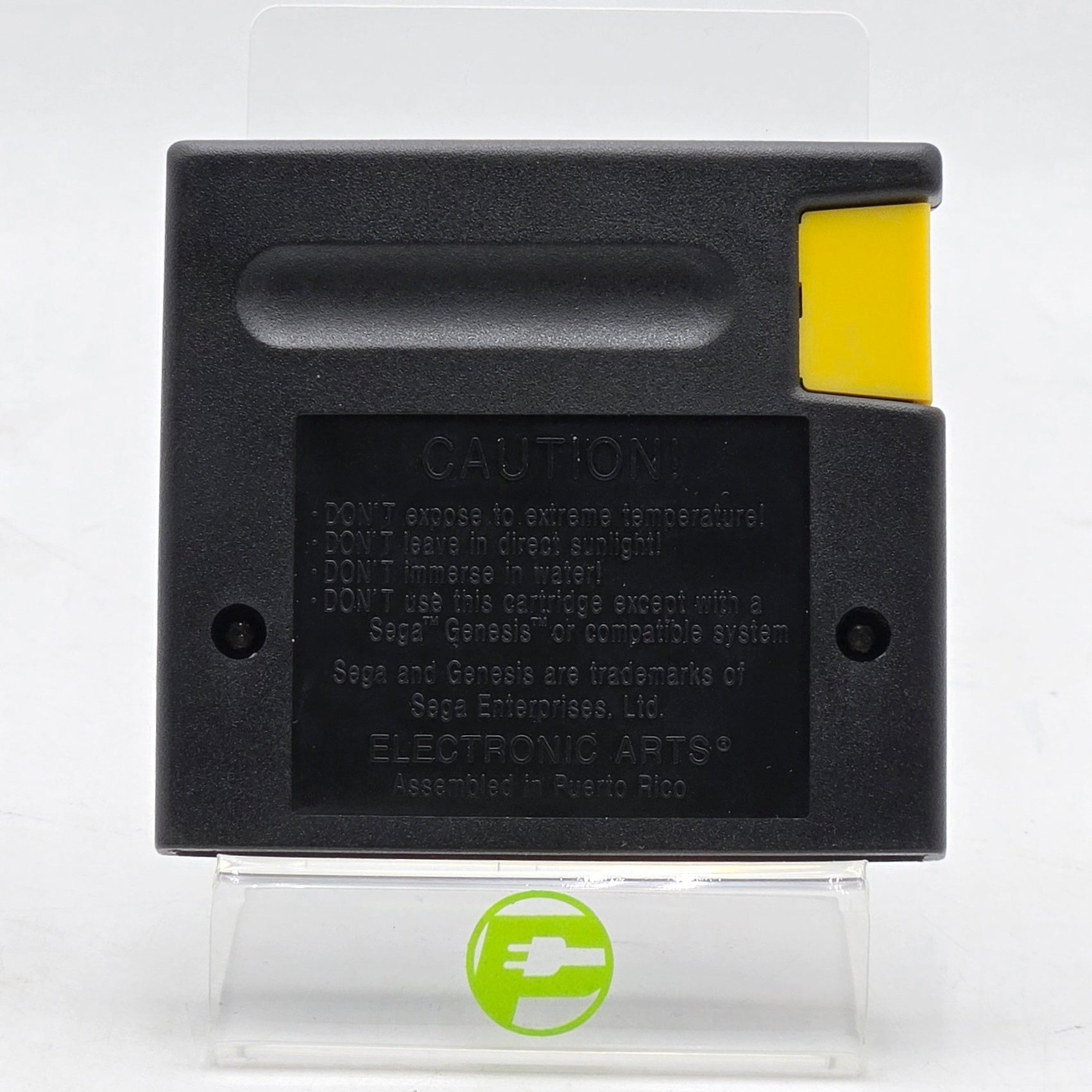 This cartridge casing/body is in good condition with some light wear from use. The label on this cartridge is ripped/water damaged, but is still readable. The connectors/pins are in fair shape with some noticeable wear from use. This can be seen in a shine from ejecting, or light discoloration from age. The case/box is in good condition with some light to moderate wear from use including some small stains, creases, or tears.